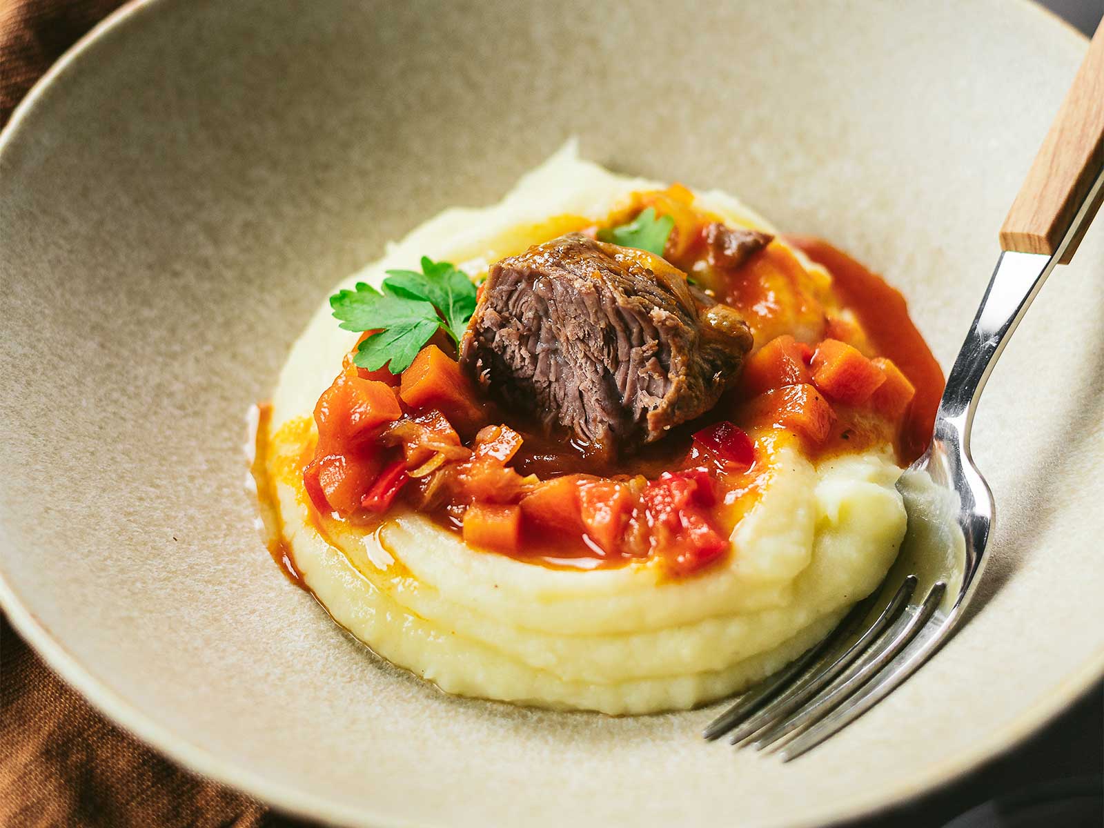 Bochechas de porco estufadas com cogumelos e puré de abóbora