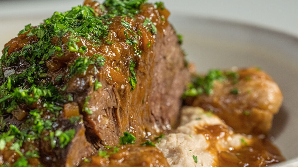 1) Sirva as bochechas sobre uma cama de puré de castanha. Junte algumas das castanhas que reservou. Regue com o molho da carne e guarneça com salsa picada. Tempere com sal e pimenta preta e sirva.
