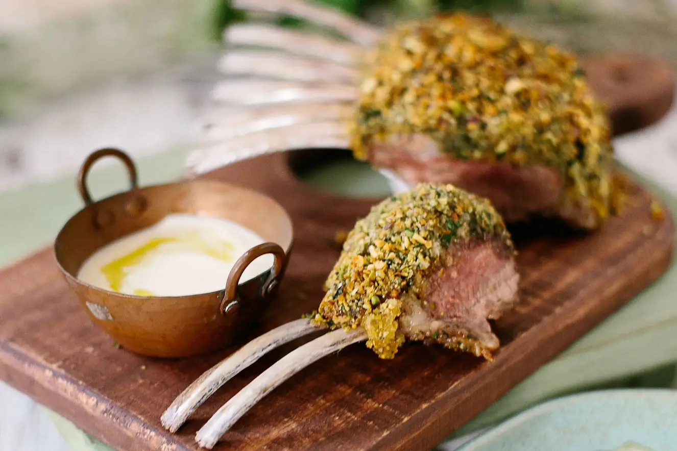 3) esfregue as costaneiras com a banha de porco, sal, pimenta recém-moída, alho picado e polvilhe com as ervas.