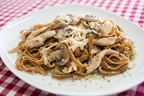 5) escorra a massa, coloque num prato e coloque o frango por cima.