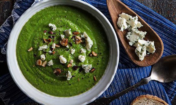 4) junte uma mão cheia de folhas de coentros à sopa e triture tudo com a varinha mágica, ou num copo liquidificador, até obter um creme. Sirva a sopa com o queijo desfeito em pedaços e com as avelãs tostadas.