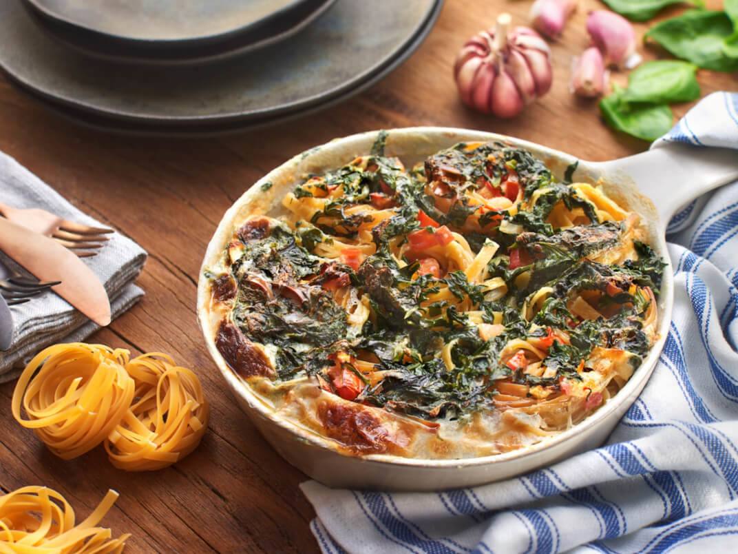 Ninhos com espinafres e molho roquefort com passas e pistácios