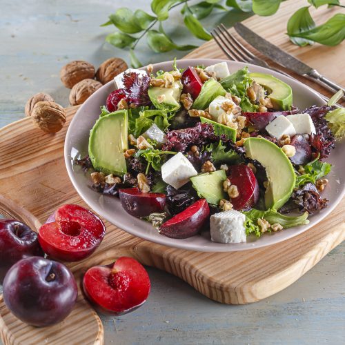 5) deite a mistura de alfaces numa saladeira, disponha por cima os pedaços de ameixa e abacate, os cubos de queijo e miolo de noz.