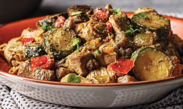 2) aqueça uma colher de sopa de azeite numa frigideira, junte os vegetais e deixe cozinhar 10 minutos.