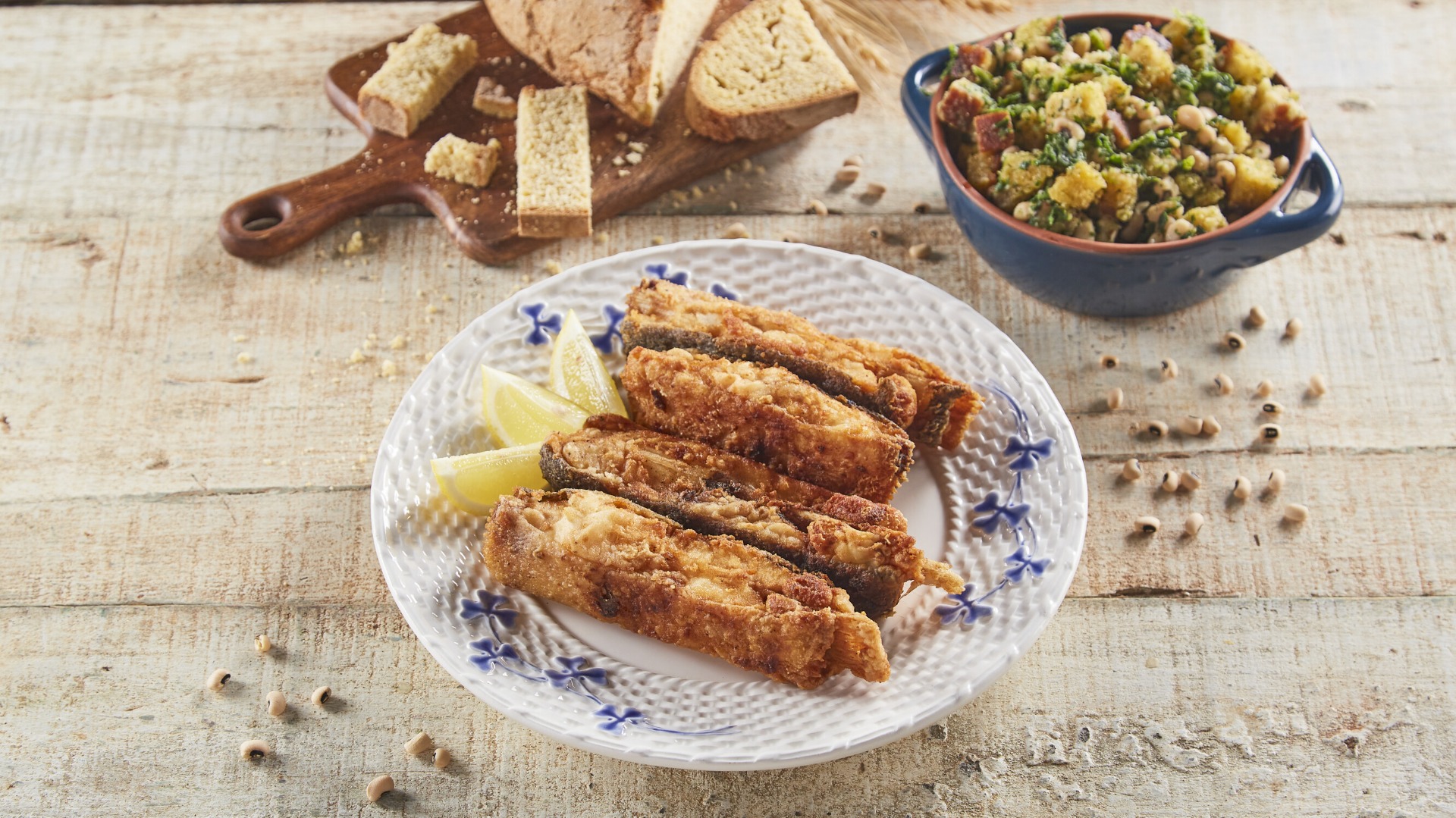 7) passe o peixe por farinha e frite em óleo quente, até que fique douradinho. Retire e acompanhe com as migas de broa, decore com limão aos gomos e sirva.