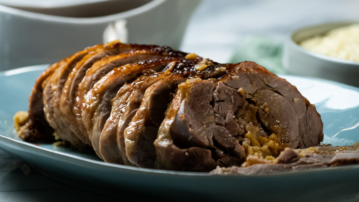 Perna de Peru Recheada com Alheira e Alperce, e Puré de Mandioca