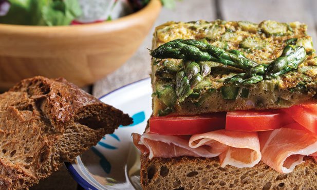4) corte o pão em duas metades e abra-as ao meio. Grelhe as partes de dentro num grelhador ou na frigideira em que fritou o ovo. Disponha duas fatias de presunto e três rodelas de tomate em cada metade e um pedaço de omelete. Termine com as pontas de espargos salteados reservadas.